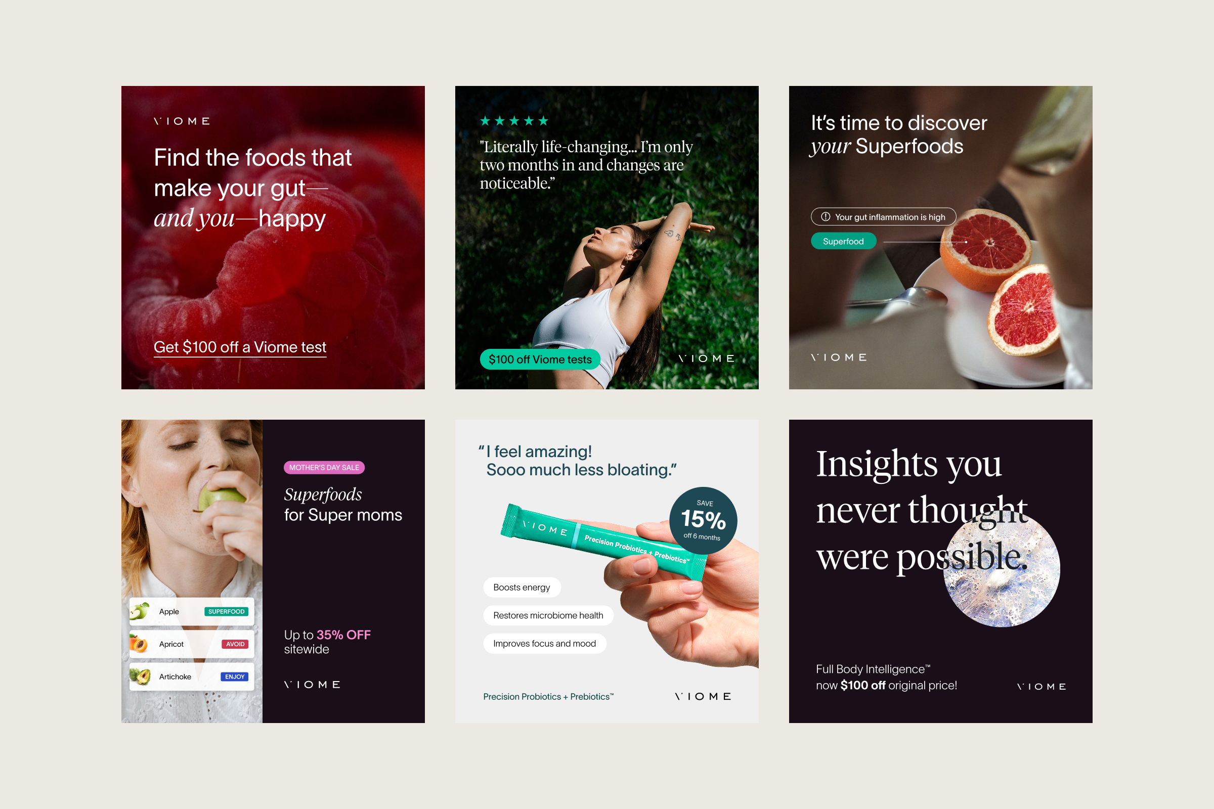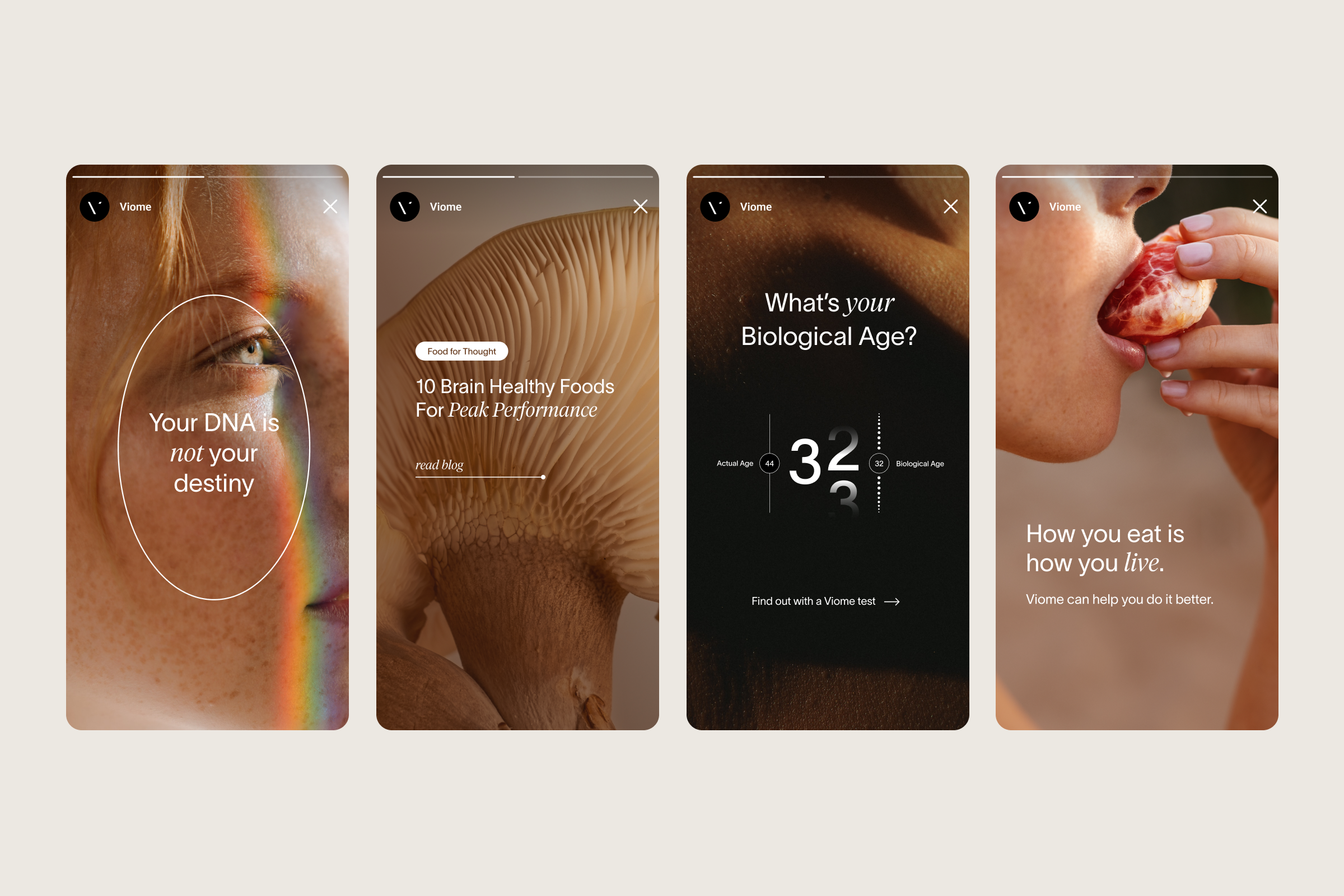 Each marketing channel had platform-specific needs and qualitative goals, requiring continuous adaptation of Viome’s brand identity. Navigating this challenge, I worked to uphold our photographic standards while incorporating the bright, upbeat, and playful tone necessary for digital engagement. The result—at times experimental—allowed Viome to stand out in oversaturated spaces, bringing a fresh and distinctive presence to its marketing efforts.