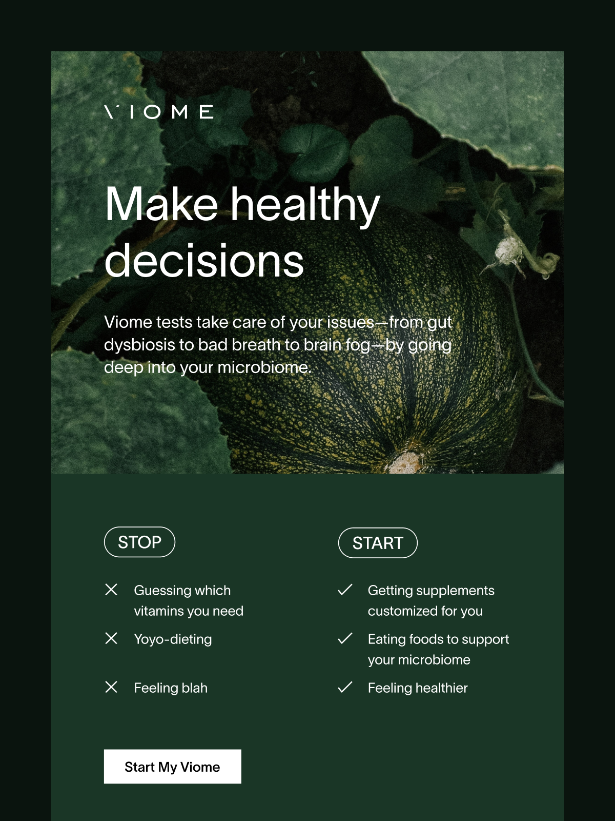 I joined Viome in 2020, leading a full-scale rebrand to unify the company's identity across all platforms. I established and implemented brand standards, contributed to the redesign of the website and app, and created cohesive marketing materials for email, social media, and photography. Managing a team of designers, I oversaw creative direction for over 80 marketing campaigns, ensuring strategic alignment and high-quality execution. Below is a selection of my work during my time with Viome.